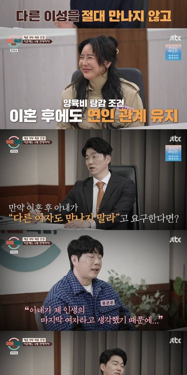 아내 측 변호사는 남편에게 "양육비를 받지 않는 대신에 다른 이성을 절대 만나지 않고 썸도 안되고, 연락도 하면 안 되고 아내와 이혼 후에도 연인 관계를 유지해야만 한다. 양육비를 받지 않고 사랑하는 마음으로"라고 말했다.