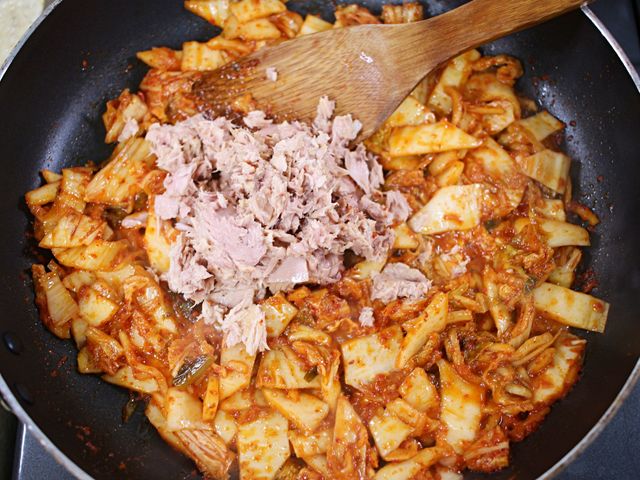 여기에 송송 썬 김치를 넣고 참치캔도 따서 넣었어요.
