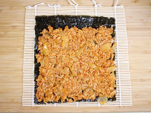 김밥김 위에 김치볶음밥을 펼쳐 주시고요.