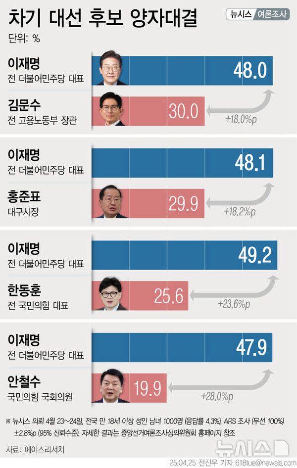 뉴시스 보도에 따르면, 에이스리서치가 뉴시스 의뢰로 지난 23~24일 전국 만 18세 이상 남녀 1000명을 대상으로 실시한 여론조사 결과 이재명 후보와 김문수 국민의힘 대선 경선 후보 간 가상 양자 대결에서 이 후보를 지지한다는 응답이 48%, 김 후보를 지지한다는 응답이 30%로 집계됐다.