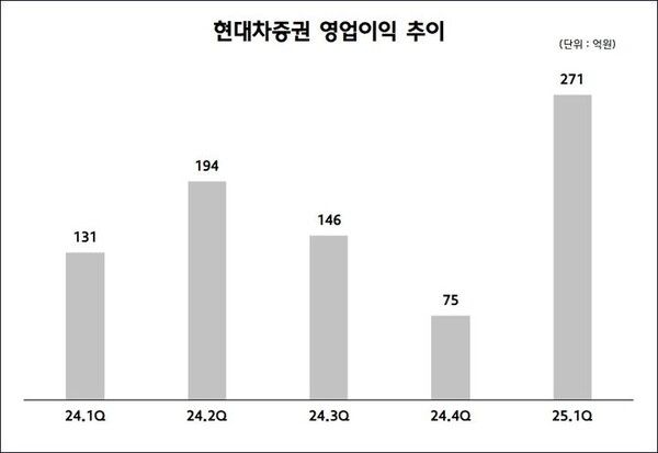 뉴시스 보도에 따르면, 현대차증권은 영업이익과 당기순이익이 각각 271억원, 193억원을 기록했다고 25일 밝혔다. 이는 전년 동기 대비 106.2%, 89.3% 증가한 수치다.