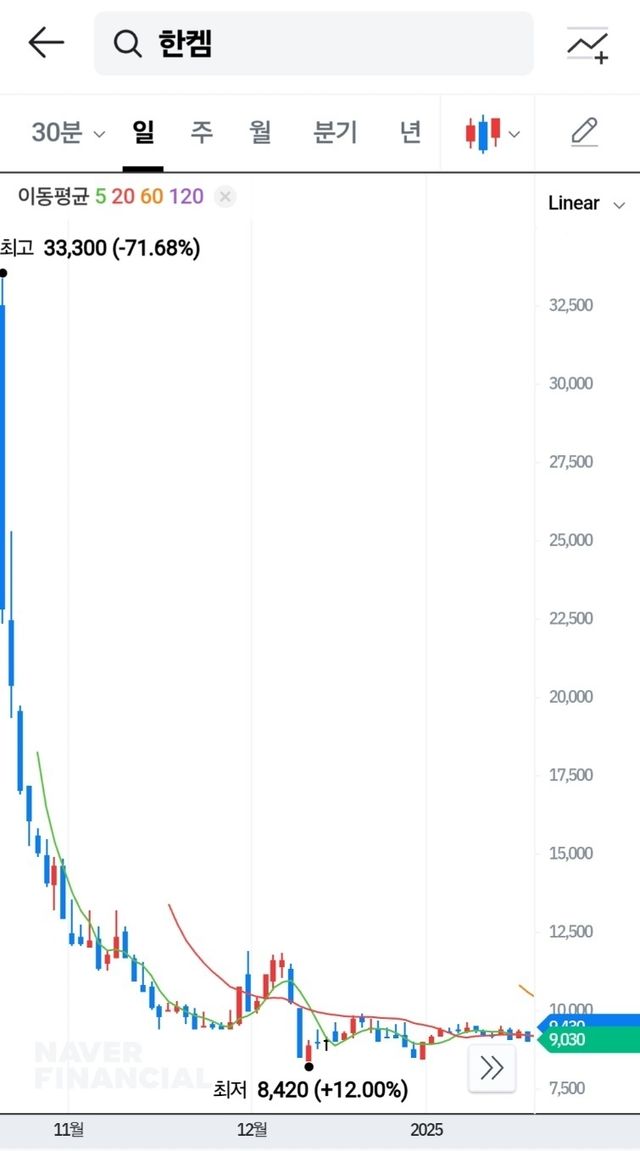 한켐 주가는 상장 첫날 26% 이상 상승마감했으나, 이후 5일 연속으로 내리 하락세를 이어갔다. 간혹 반등이 나왔지만 지속적인 하락세를 보인 한켐 주가는 지난 4월초 8200원까지 떨어졌다. 현재는 소폭 반등해 9000원대 전후로 등락을 보이고 있다.