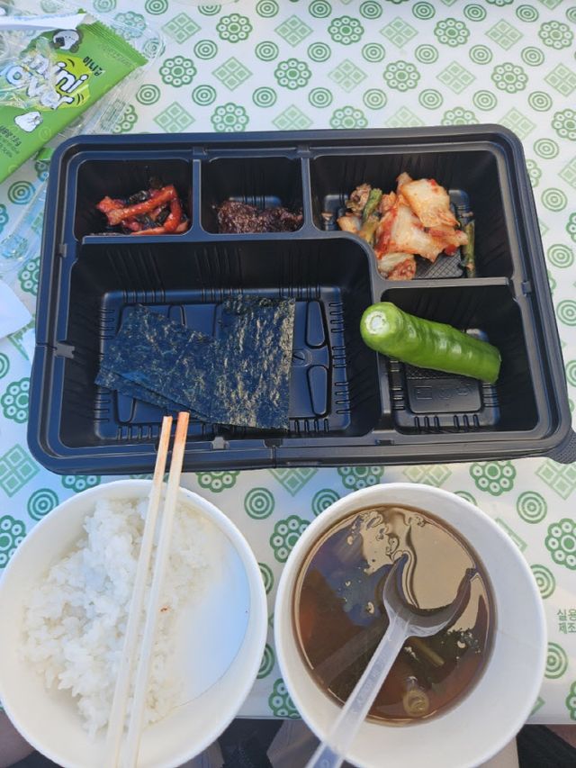 해당 도시락은 반찬으로 조미김 몇 장과 풋고추, 김치, 깻잎절임 등이 전부였다.