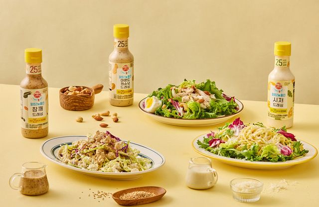 이번 신제품은 유화형 타입으로 '참깨 드레싱', '아몬드캐슈넛 드레싱', '시저 드레싱' 등 총 세 가지 제품이다. '참깨 드레싱'은 볶음 참깨의 고소함과 간장의 감칠맛을 구현했다. '아몬드캐슈넛 드레싱'은 견과류의 고소함과 깊은 부드러움을 담았다. '시저 드레싱'은 파마산 치즈와 엔초비의 고소한 감칠맛을 느낄 수 있다.