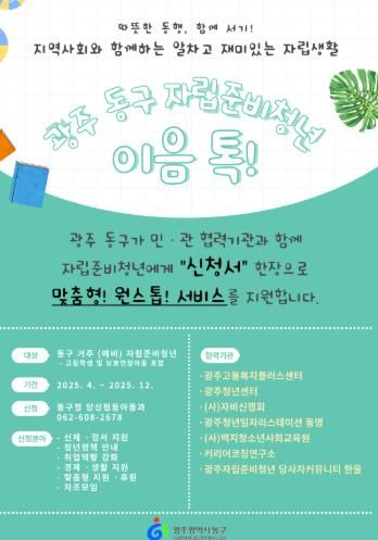 동구는 자립준비청년의 성공적인 자립 지원을 위해 지난 2월 광주광역시 고용복지플러스센터, 광주청년센터, (사)자비신행회, (사)맥지청소년사회교육원, 커리어코칭연구소, 광주자립준비청년 당사자커뮤니티 한울 등 총 7개 민관 기관과 업무협약을 체결했다.