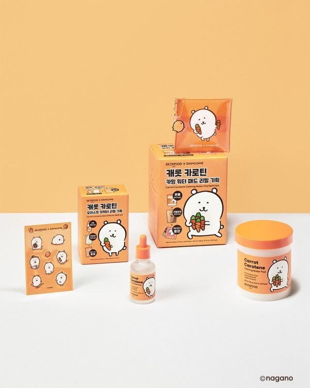 스킨푸드가 나가노 작가의 인기 캐릭터 담곰이와 협업한 '캐롯 카로틴(당근) 라인' 기획 세트 2종을 오는 27일 출시한다고 밝혔다.