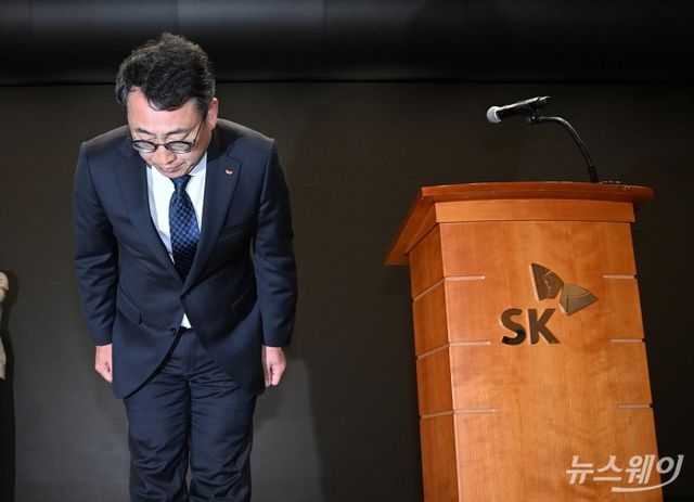 유영상 SK텔레콤 대표가 25일 서울 중구 SKT타워에서 지난 22일 발생한 해킹공격으로 가입자 유심(USIM) 정보가 유출된 것과 관련해 고개 숙여 사과하고 있다. 사진=이수길 기자 Leo2004@newsway.co.kr