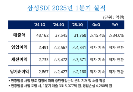 [뉴스락] 삼성SDI가 올해 1분기 매출 3조1768억원, 영업손실 4341억원을 기록했다고 25일 공시했다.