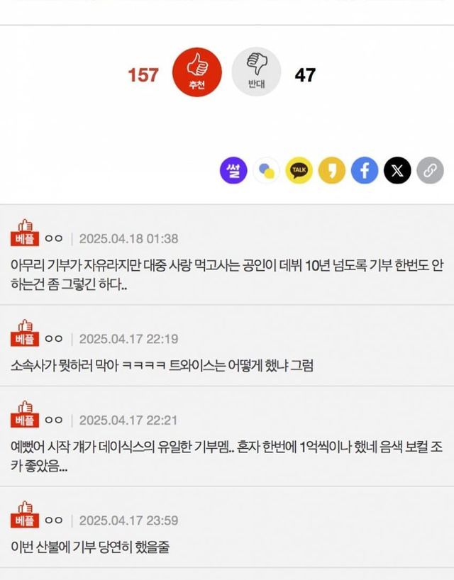 이미지랑 다르게 공식적으로 기부한 적이 한 번도 없어서 팬들도 의아해하는 중...