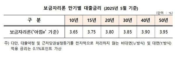 뉴시스 보도에 따르면, '아낌e-보금자리론' 기준 연 3.65%(10년)~3.95%(50년)가 적용된다.