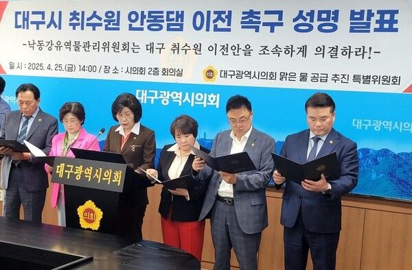대구시의회 ‘맑은 물 공급 추진특별위원회(위원장 박종필, 이하 특위)’는 25일 오후 시의회 2층 회의실에서 발표한 성명을 통해 정부 낙동강유역물관리위원회에 ‘대구 취수원 이전안’의 조속한 의결을 촉구했다.