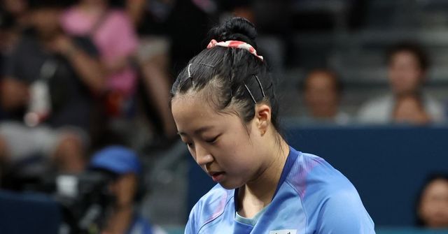 한국 탁구대표팀 신유빈이 지난해 8월 3일(한국 시각) 프랑스 파리 사우스 파리 아레나 4에서 열린 '2024 파리올림픽' 탁구 여자 단식 동메달 결정전 일본 히나 하야타와의 경기에서 실점에 아쉬워 하고 있다. / 뉴스1