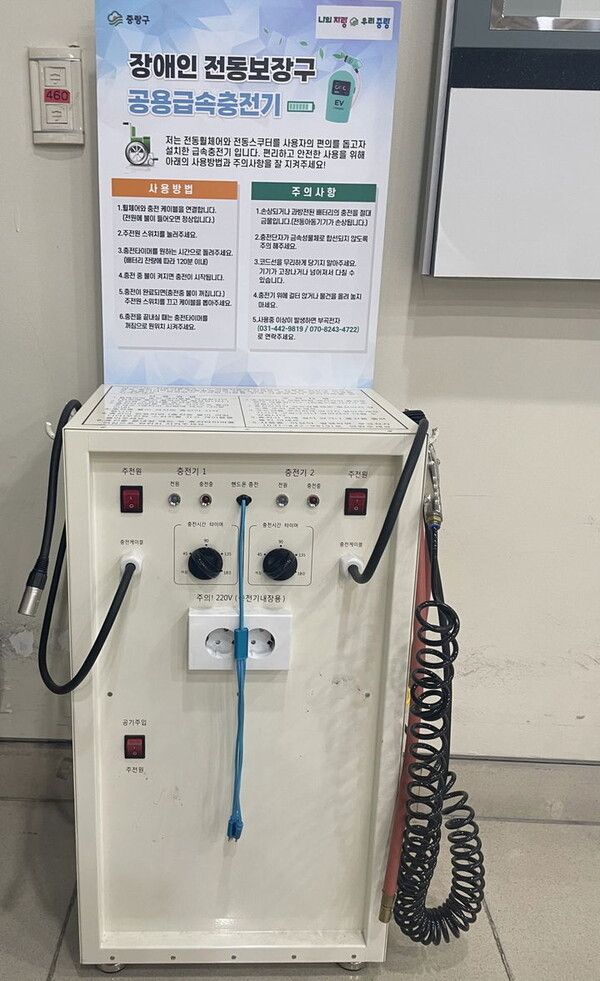 서울 중랑구(구청장 류경기)가 장애인 생활 편의 증진을 위해 전동 휠체어·전동 스쿠터 사용자를 위한 급속 충전기를 4개소에 추가 설치했다고 25일 밝혔다.