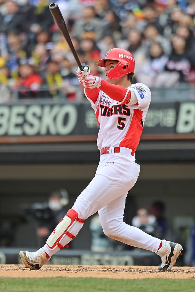 지난해 KBO리그 정규시즌 최우수선수(MVP) 김도영은 이날 경기에 앞서 1군 엔트리에 등록됐다. 지난달 22일 열린 NC 다이노스와의 정규시즌 개막전 햄스트링을 다쳐 전열에서 이탈한 뒤 34일 만이었다. 부상 재발을 우려해 이날 경기에 대타로 대기했는데 결정적인 찬스에서 존재감을 뽐냈다. KIA는 2사 만루에서 최형우의 2타점 역전 적시타로 5-3 앞섰다.