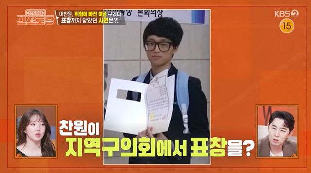 그런가 하면, 이찬원이 용감한 학생으로 지역에서 표창을 받았던 비화도 공개됐다. 선생님은 "학교로 서류가 하나 날라왔다. 지역구의회에서 제보가 들어왔다"고 운을 뗐고, 이찬원은 "그래서 달서구에서 표창 받았다"고 덧붙였다.