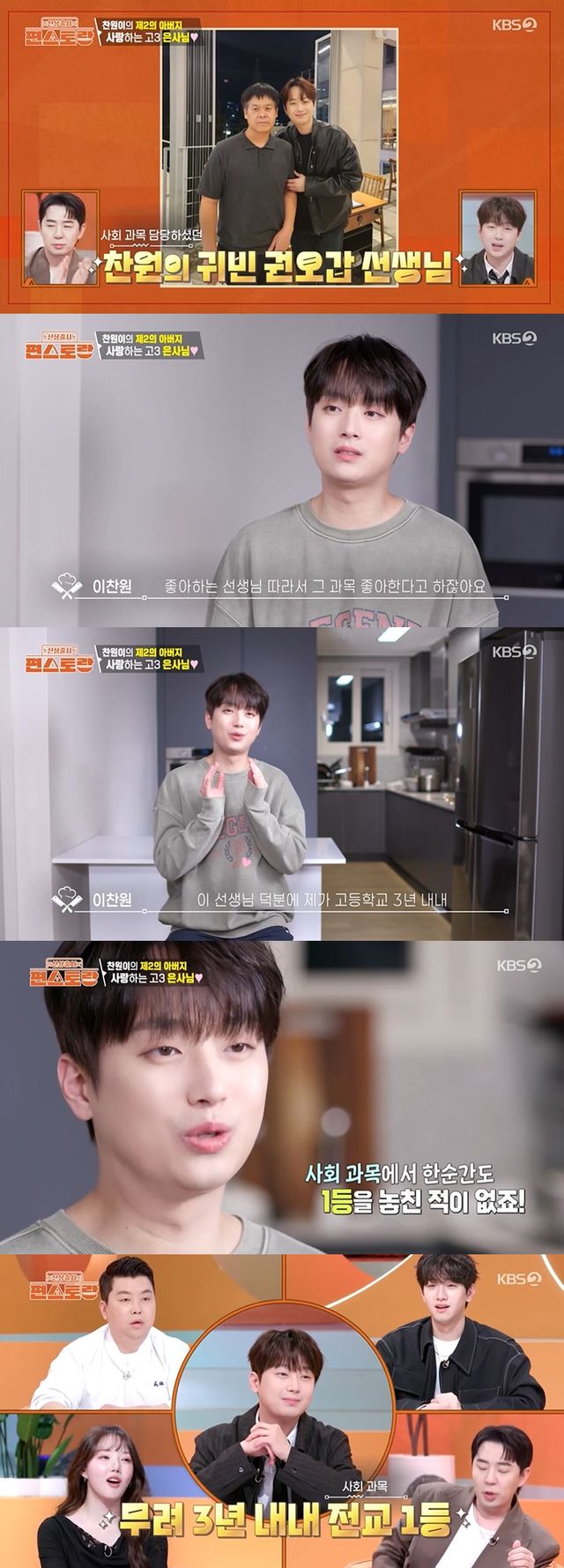 이어 이찬원이 기다리던 손님의 정체가 공개됐다. 바로 이찬원의 고등학교 3학년 담임 선생님이었다. 이찬원은 "제 인생을 송두리째 바꿔주신 고등학교 3학년 스승님"이라며 "좋아하는 선생님 따라서 그 과목 좋아한다고 하지 않냐. 이 선생님 덕분에 제가 고등학교 3년 내내 사회 과목에서 한순간도 1등을 놓친 적이 없다"고 밝혔다.