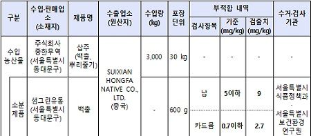 회수 대상은 ‘주식회사 중한무역(서울특별시 동대문구)’에서 수입한 중국산 삽주(백출)(생산년도: 2023년)와 이를 ‘샘그린유통(서울특별시 동대문구)’에서 소분·판매한 제품(소비기한: 2028.3.31.까지)이다.