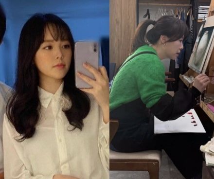 공개된 사진 속 하희라는 밝은 초록색 니트를 입고 있으며 머리카락을 질끈 묶은 헤어스타일을 한 채로 오직 그림 그리기에만 열중하고 있다.