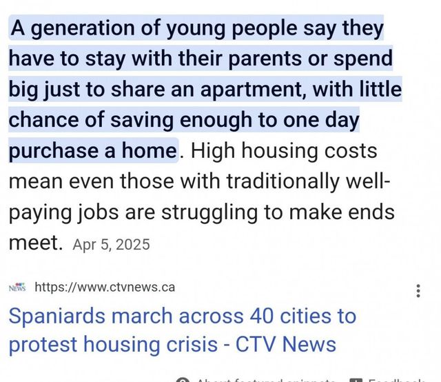 스페인 정부 통계 기준으로도 스페인 국민 40% 이상의 월급 40% 이상이 월세로 나가고 있으며 이는 전국 평균이고 양질의 일자리가 몰리는 대도시인 바르셀로나랑 마드리드는 더 심각해짐.