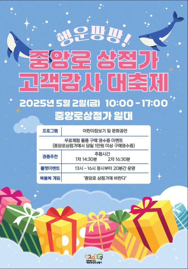 [한라일보] 제주시 중심상권인 중앙로 상점가에서 오는 5월 2일 오전 10시부터 오후 5시까지 '행운 팡팡! 중앙로 상점가 고객감사 대축제'가 열린다.