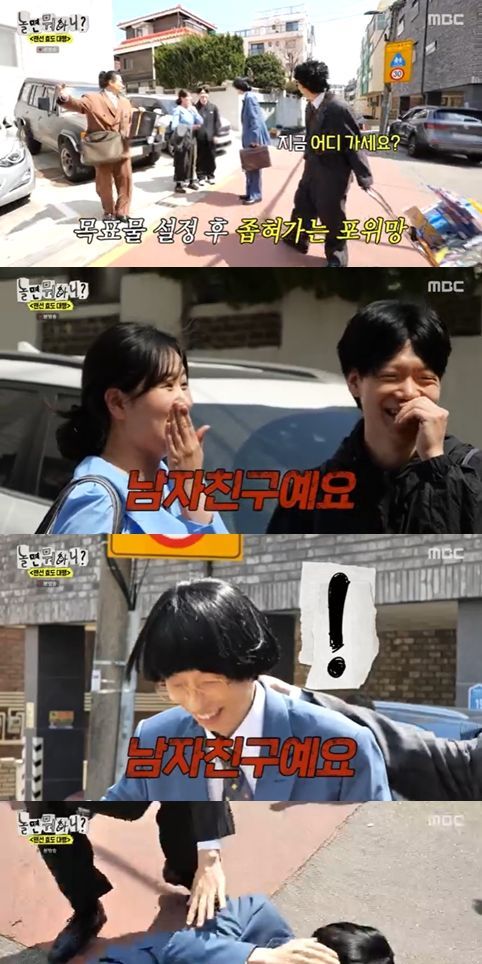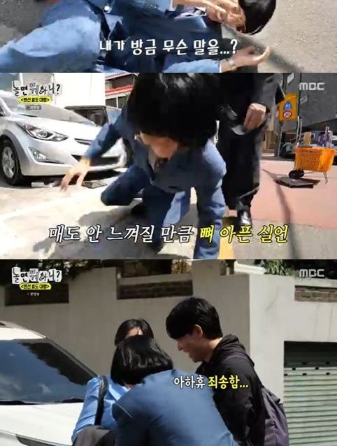 이에 당황한 표정을 지으며 남자 친구라고 답하자 유재석은 어쩔 줄 몰라 하면서 "죄송하다. 그렇지 않아도 이상하다고 생각했다. 저도 이게 느낌이 학원 차림이라"라며 열심히 해명하는 모습을 보였다. 이에 하하는 유재석을 바닥으로 내동댕이치며 "미친 거 아니야?"라며 유재석에게 언성을 높이는 모습을 보였다.