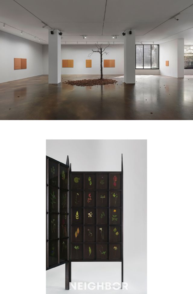 (위) 전시 <자연국가> K2 1층 설치 전경. 이미지 제공 국제갤러리. (아래) 최재은, ‘새로운 유대’, 2025, Wood structure with pressed flowers on 112 urushi lacquered wood panel, framed, 212.6×238×6.9cm. Courtesy of the artist and Kukje Gallery. 사진 최재은 스튜디오, 이미지 제공 국제갤러리.