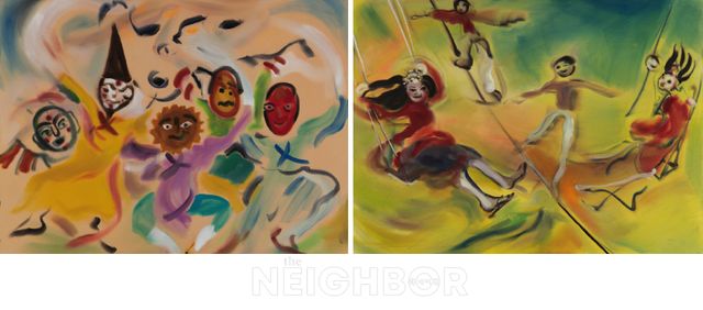 (왼쪽)소피 폰 헬러만, '탈춤', 2025, Acrylic on canvas, 180×230cm. (오른쪽)소피 폰 헬러만, ‘단오’, 2025, Acrylic on canvas, 256×352cm.