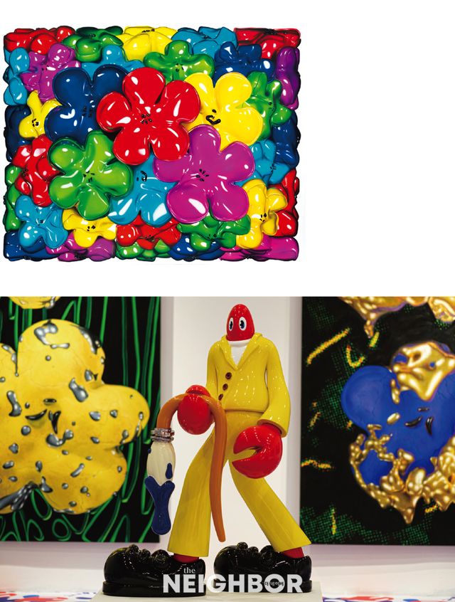 (위)Philip Colbert, ‘Flowers III’, 2025, Oil on canvas, 250×320×5cm. (아래)Philip Colbert, ‘The Lobster Painter(Yellow)’, 2022, Painted stainless steel, 120×78×55cm.