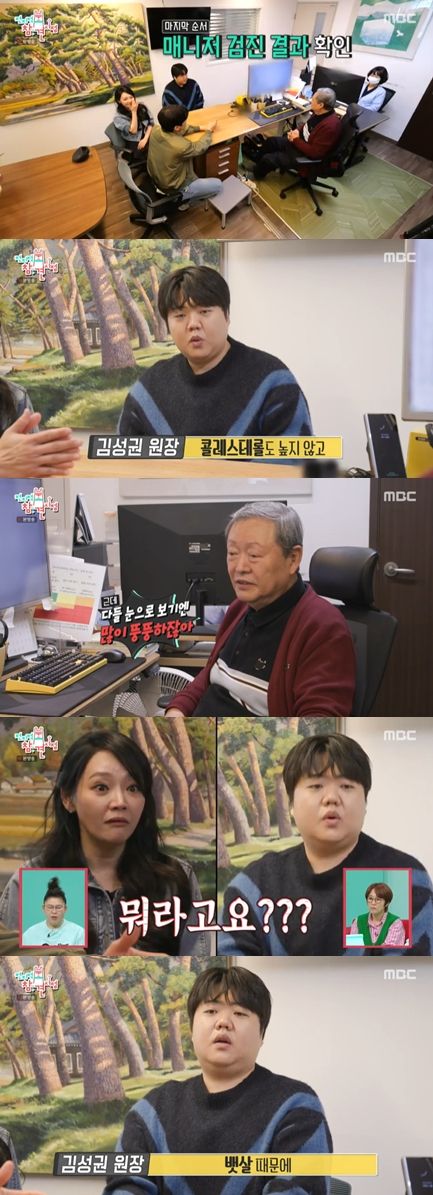 또 김성권은 "지방간이 심하다. 뱃살 있는 거는 짜게 먹고 많이 먹는 거다. 몸무게 줄이세요"라고 조언하며 담배를 피우냐고 물었다.