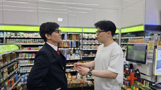 붉은 넥타이와 검은 정장 차림의 정 씨는 삼각김밥을 계산하며 “데워 드릴까요?”라고 묻는 한 후보에게 “네? 제가 이걸 살 거라는 걸 어떻게 아시죠?”라고 되물었다. 한 후보 특유의 화법을 따라 한 것이다.