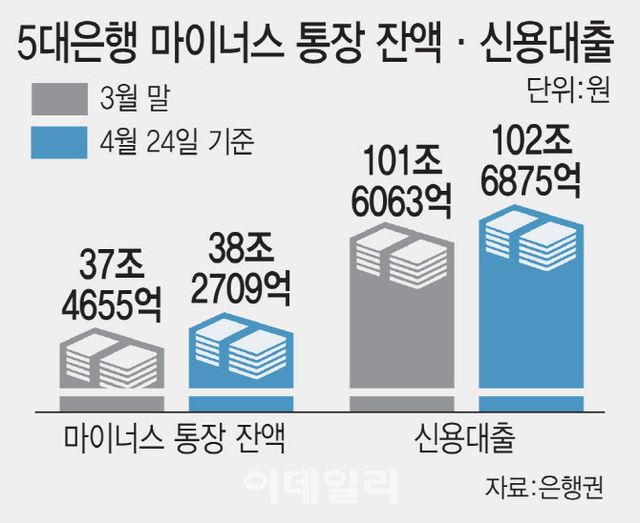 27일 금융권에 따르면 지난 24일 기준 5대 은행 마이너스 통장 잔액은 38조 2709억원으로 집계됐다. 전달 말(37조 4655억원)보다 8054억원 늘어난 것이다. 단순 계산하면 하루 평균(18영업일 기준) 447억원씩 늘었다. 같은 기간 5대 은행 신용대출 잔액도 101조 6063억원에서 102조 6875억원으로 1조 812억원이 늘었다.