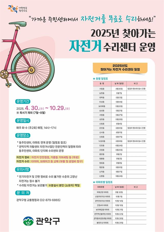 ‘찾아가는 자전거 수리센터’ 운영 일정과 장소는 관악구청 홈페이지 및 각 동주민센터 게시판에서 확인할 수 있으며, 자세한 문의는 관악구청 교통행정과(☎02-879-6865)로 하면 된다.