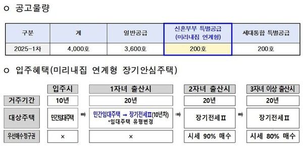 특히 올해 신혼부부 특별공급의 경우 '미리내집'과 연계해 입주대상자를 모집한다고 시는 설명했다. 미리내집 연계형 장기안심주택은 이번 공고 200가구를 포함해 올해 총 500가구를 공급할 예정이다.