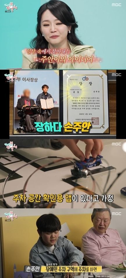 주안 군은 "주차장을 만들었다. 앱이 깔려있어서 켜진다. 주차장에 자동차가 들어가고, 장애인 주차 구역에 주차하면 초음파 센서가 감지한다. 차가 나가면 (앱으로) 빈 공간을 알게 돼 주차할 수 있다"며 "엄마, 아빠 공연 보러 가면 장애인 분들이 주차 구역 찾으려고 돌아다니는 걸 본 적 있다. 장애인 분들이 더 편하게 주차할 수 있게 만들었다"고 설명했다.