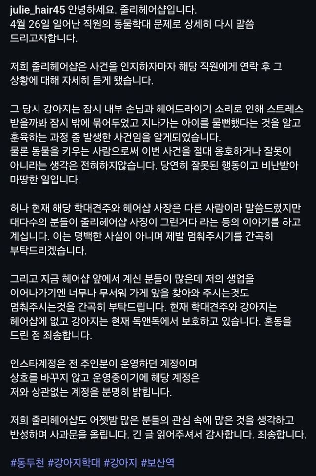 사장 입장 : 강아지가 지나가는 아이를 물뻔해서 훈육하던 과정이었다