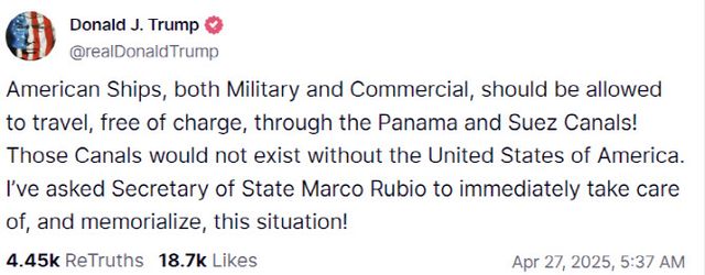 트럼프 대통령은 27일(현지시간) 트루스소셜에 “미국의 군함과 상선들은 파나마운하와 수에즈운하를 무료로 통과할 수 있어야 한다! 이 운하들은 미국이 없었다면 존재하지도 않았을 것”이라며 “나는 마코 루비오 국무장관에게 즉시 이 문제를 처리하고 공식화할 것을 요청했다!”고 적었다.