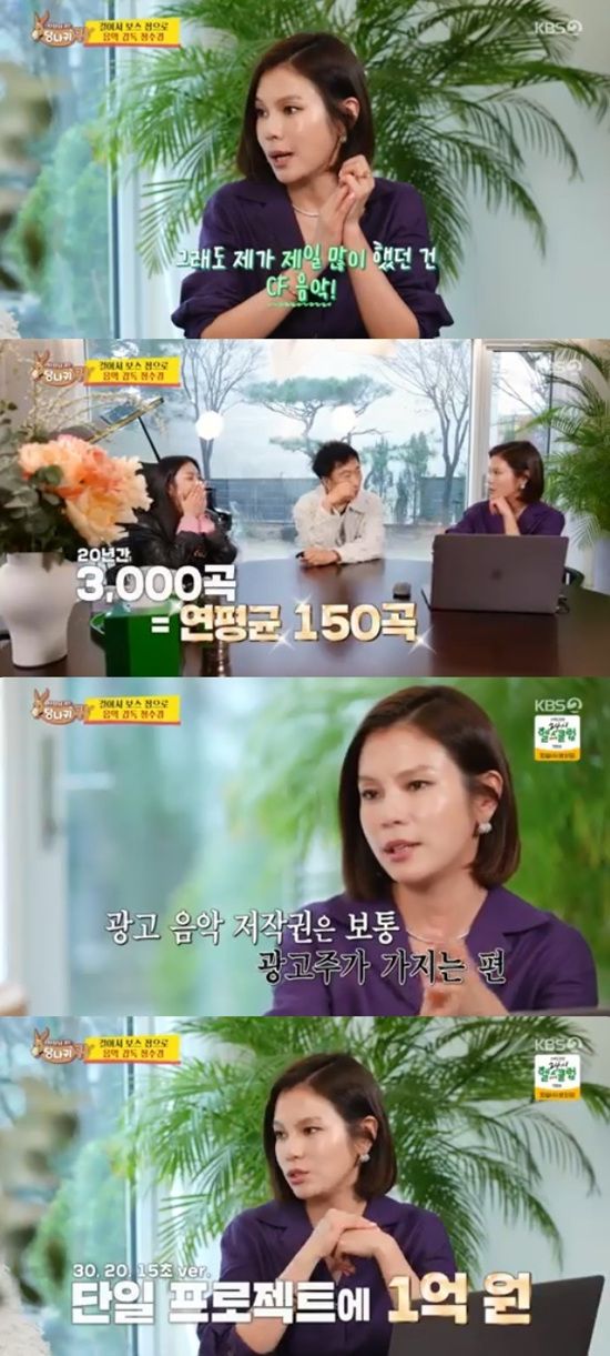 전수경은 그간 작업한 광고음악 중 최고가는 중국 브랜드와의 프로젝트였는데 1억을 받았다고 털어놨다.