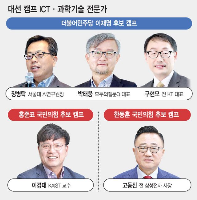 반면 홍준표 국민의힘 경선 후보 캠프에는 이병태 KAIST 교수가 정책총괄본부장을 맡고 있으며, 박수용 전 정보통신산업진흥원(NIPA) 원장은 디지털가상화폐대책본부장으로 활동 중이다. 표철수 전 방송통신위원회 상임위원은 언론특보단장을 맡아 2022년 대선에 이어 방송통신 정책을 지원하고 있다.