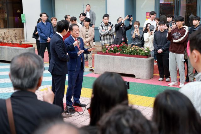 홍 후보는 그동안 한 대행의 대선 출마에 부정적이었으나 최근 단일화를 수용하겠다는 쪽으로 입장을 틀었다. 그는 이날도 “정당 후보가 됐는데 무소속 후보가 나오면 또 단일화하라는 건 비정상”이라면서도 “지금 상황이 그렇게라도 하지 않으면 일대일 구도가 안 된다”며 입장을 바꾼 이유를 설명했다. 홍 후보가 양보 가능성을 밝히자 일부 지지자는 ‘양보하지 마세요’, ‘안 돼요’라고 외쳤다.