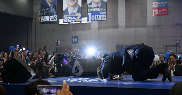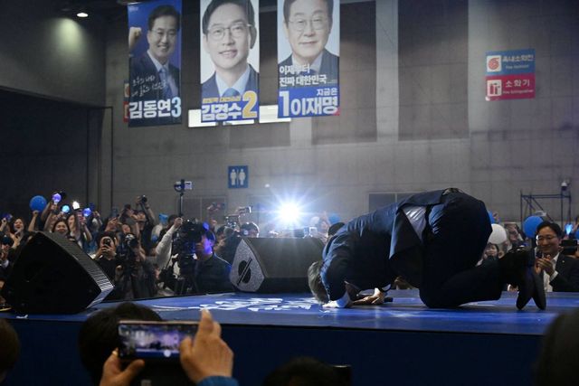 21대 대선 더불어민주당 후보로 선출된 이재명 후보가 27일 경기 고양시 킨텍스에서 열린 수도권·강원·제주 합동연설회에서 수락연설을 마친뒤 큰절하고 있다 / 뉴스1
