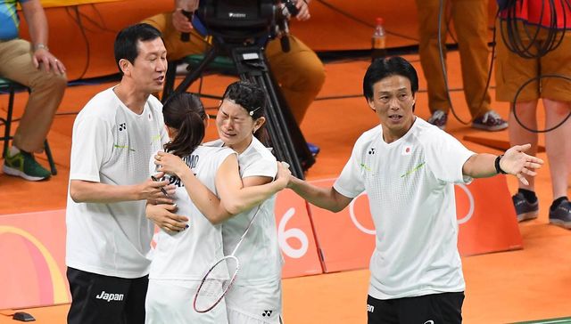 박주봉 일본 배드민턴 대표팀 감독이 2016년 8월 18일(현지시간)브라질 리우 센트루 파빌리온4에서 열린 2016 리우올림픽 배드민턴 여자복식 결승전에서 금메달을 확정한 마쓰토모 미사키-다카하시 아야카를 격려하고 있다 / 뉴스1