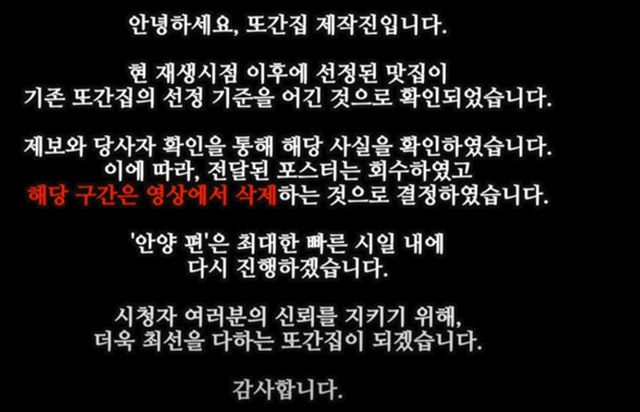 끝으로 "또간집은 지난 3년간, 단 한건의 맛집 광고를 받지 않은 점을 시청자분들께 다시 한번 명확히 말씀드린다"며 "앞으로 같은 일이 반복되지 않도록 최선을 다하여 노력하겠다"고 덧붙였다.