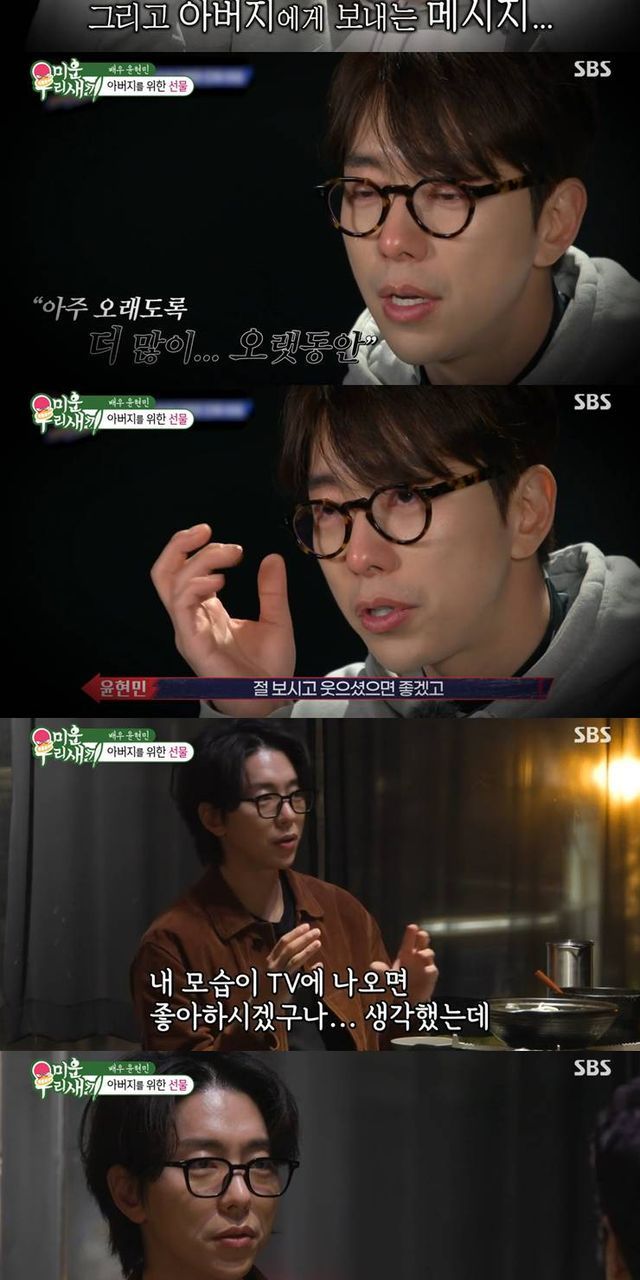 윤현민은 "아버지 투병생활할 때 쉬었지 않냐. 아빠 뒷좌석에 태워서 병원 가니까 아버지가 '너 이제 망했어? 너 왜 일 안 해'라고 하시더라. '아빠가 건강해져야 드라마를 찍지'라고 했다. 건강 회복하라고"라고 이야기했다. 그러면서 "집에 가서 생각해 보니까 아빠는 TV에 나오는 내 모습, 이게 어떻게 보면 아빠가 빨리 나을 수 있던 게 아니었을까 싶었다"라며 "회사에 가장 빨리 TV에 나올 수 있는 거 뭐 있냐고 하니까 드라마는 몇 개월 후에 나오니까 안되고, 예능이 하나 들어왔었는데 3주 있다 나갈 것 같다고 하더라. 그래서 그걸 하겠다고 했다. 다 찍었는데 첫 방송 전에 아버지가 돌아가셔서 너무 아쉬웠다"라며 눈시울을 붉혔다.