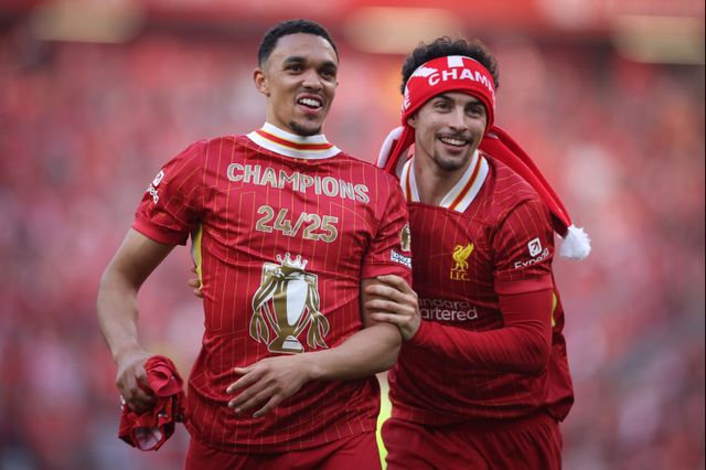 epa12059475 Trent Alexander-Arnold of Liverpool (L) and Curtis Jones of Liverpool (R) celebrate winning the Premier League title after the English Premier League soccer match between Liverpool FC and Tottenham Hotspur, in Liverpool, Britain, 27 April 2025. EPA/ADAM VAUGHAN EDITORIAL USE ONLY. No use with unauthorized audio, video, data, fixture lists, club/league logos, 'live' services or NFTs. Online in-match use limited to 120 images, no video emulation. No use in betting, games or single club/league/player publications./2025-04-28 05:48:56/