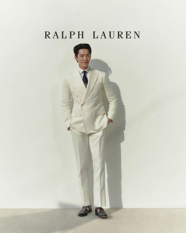 이날 김우빈은 랄프 로렌 퍼플 라벨의 더블 브레스티드 화이트 수트와 RL 모노그램이 돋보이는 타이를 착용해 클래식한 룩을 선보였다.
