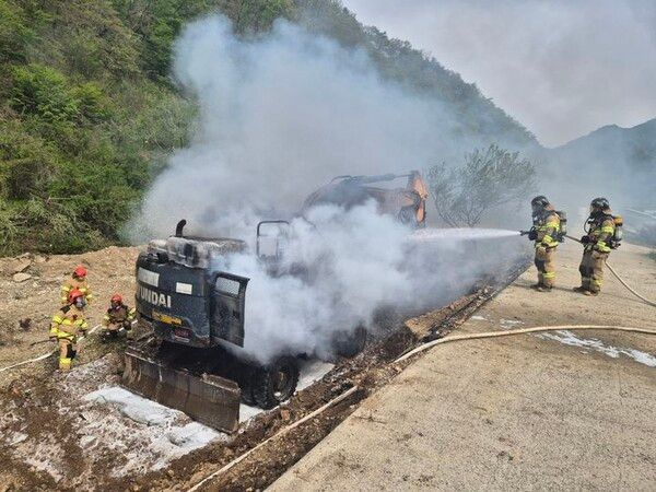 뉴시스 보도에 따르면, 28일 금산소방서에 따르면 이 굴착기 운전자가 "굴착기에서 검은 연기가 난다"는 신고를 접수했다.