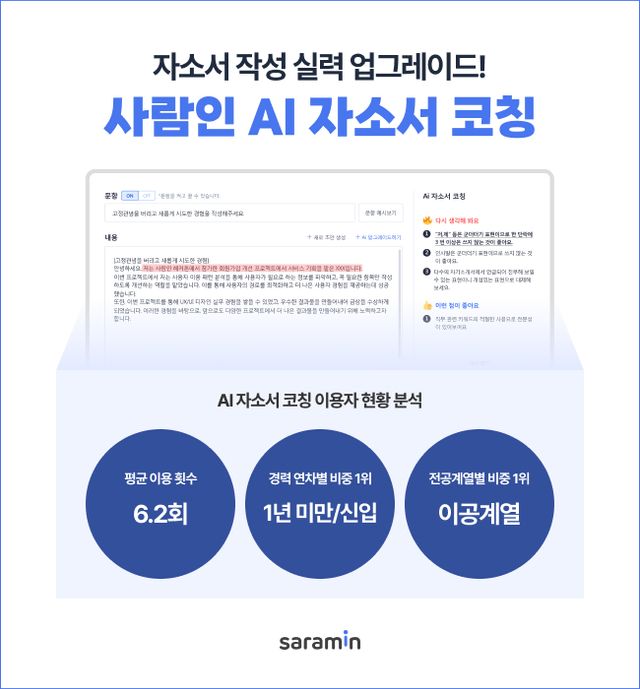 사람인은 지난해 4월부터 올해 2월까지 ‘사람인 AI 자소서 코칭’ 서비스 이용 현황을 발표했다. 사람인이 지난 2022년 선보인 AI 자소서 코칭은 구직자의 자소서를 AI가 분석해 문맥, 표현, 단어 등 다양한 부분의 개선점을 제안하는 서비스다. 자연어처리(NLP) 분석 알고리즘에 기반해 키워드나 맞춤법 검사 등 기초적 범위를 넘어, 글의 맥락을 이해하고 진부한 표현까지 체크해 알려준다.