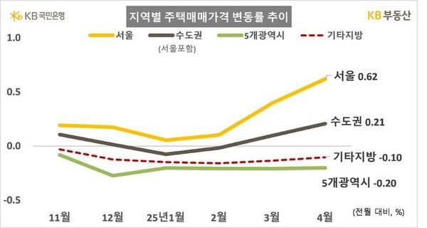 서울 주택 매매가격은 0.62% 상승했다. 서울의 경우 지난해 9월부터 상승폭이 둔화하는 추세였으나 지난달(0.40%)부터 상승폭이 다시 확대됐다. 최근 6개월간 추이를 살펴보면 2024년 11월 0.19%→2024년 12월 0.17%→2025년 1월 0.05%→2025년 2월 0.10%→2025년 3월 0.40%→2025년 4월 0.62%로 올 들어 상승곡선이 점차 가팔라졌다.