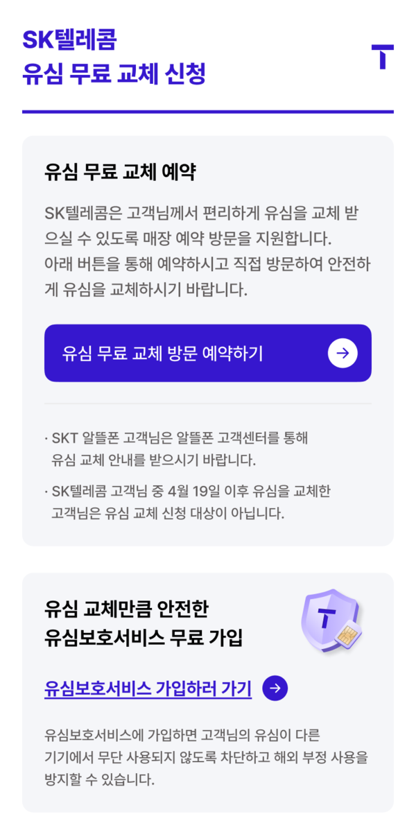 [뉴스락] SK텔레콤이 사이버 침해 피해를 막기 위해 28일 오전 10시부터 전국 2600여 곳의 T월드 매장에서 유심 무료 교체 서비스를 시작하며, 동시에 온라인 예약 시스템을 운영한다.