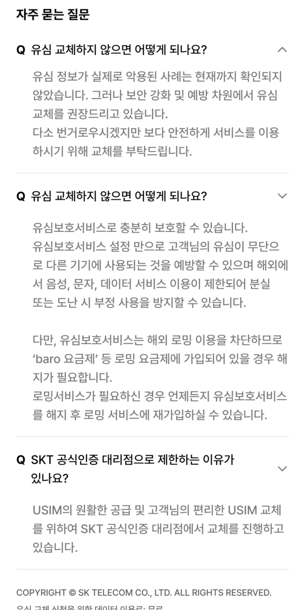 SK텔레콤은 다회선 가입자를 위해 본인 소유 회선 전체를 일괄 신청하는 기능도 마련했다. 다회선 고객은 시스템에서 스마트폰, 태블릿, 워치 등 보유한 본인 명의 유심을 한 번의 신청으로 교체할 수 있다.